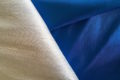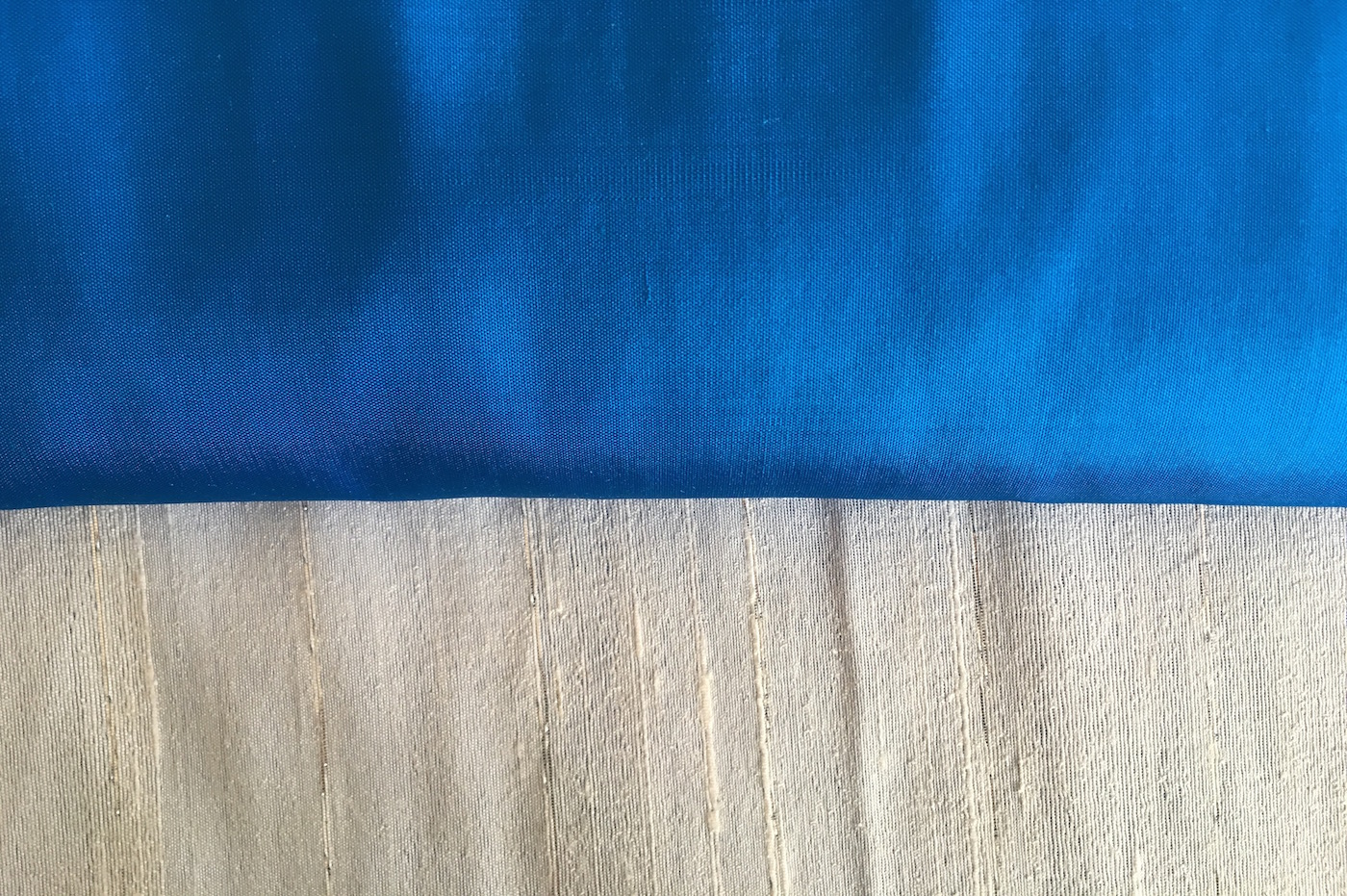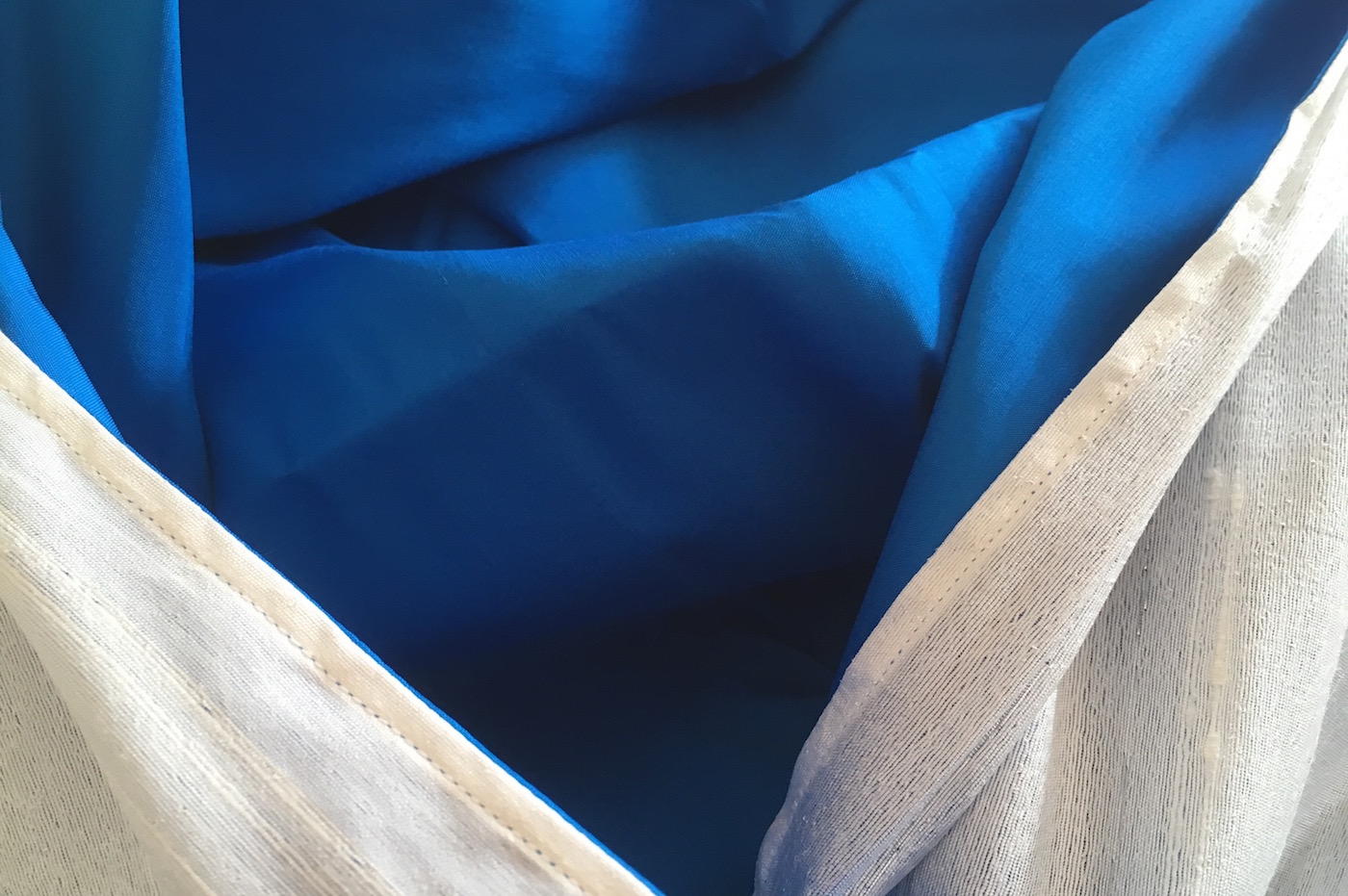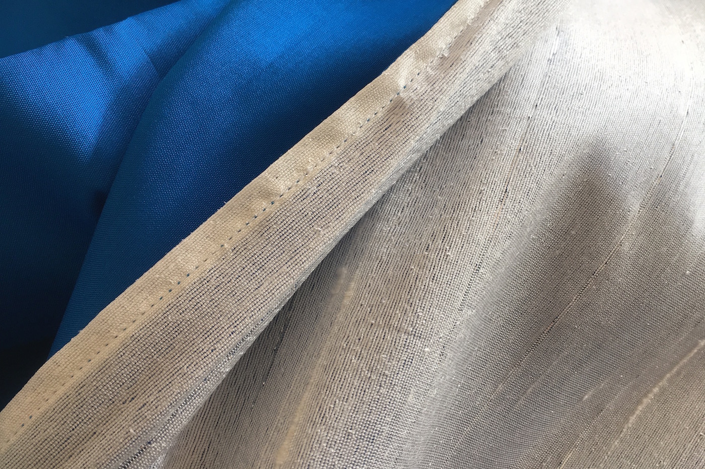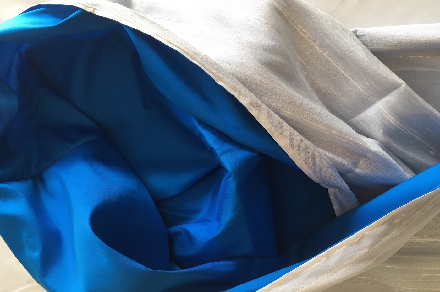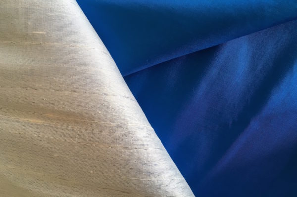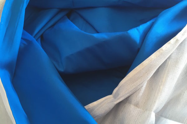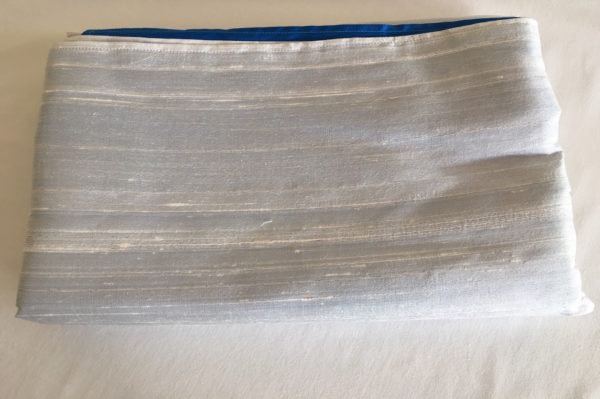 Dit is een Rang Mai zijde wade in de kleur blauw aan de buitenkant creme kleur met een subtiel zilveren draadje er doorheen geweven.